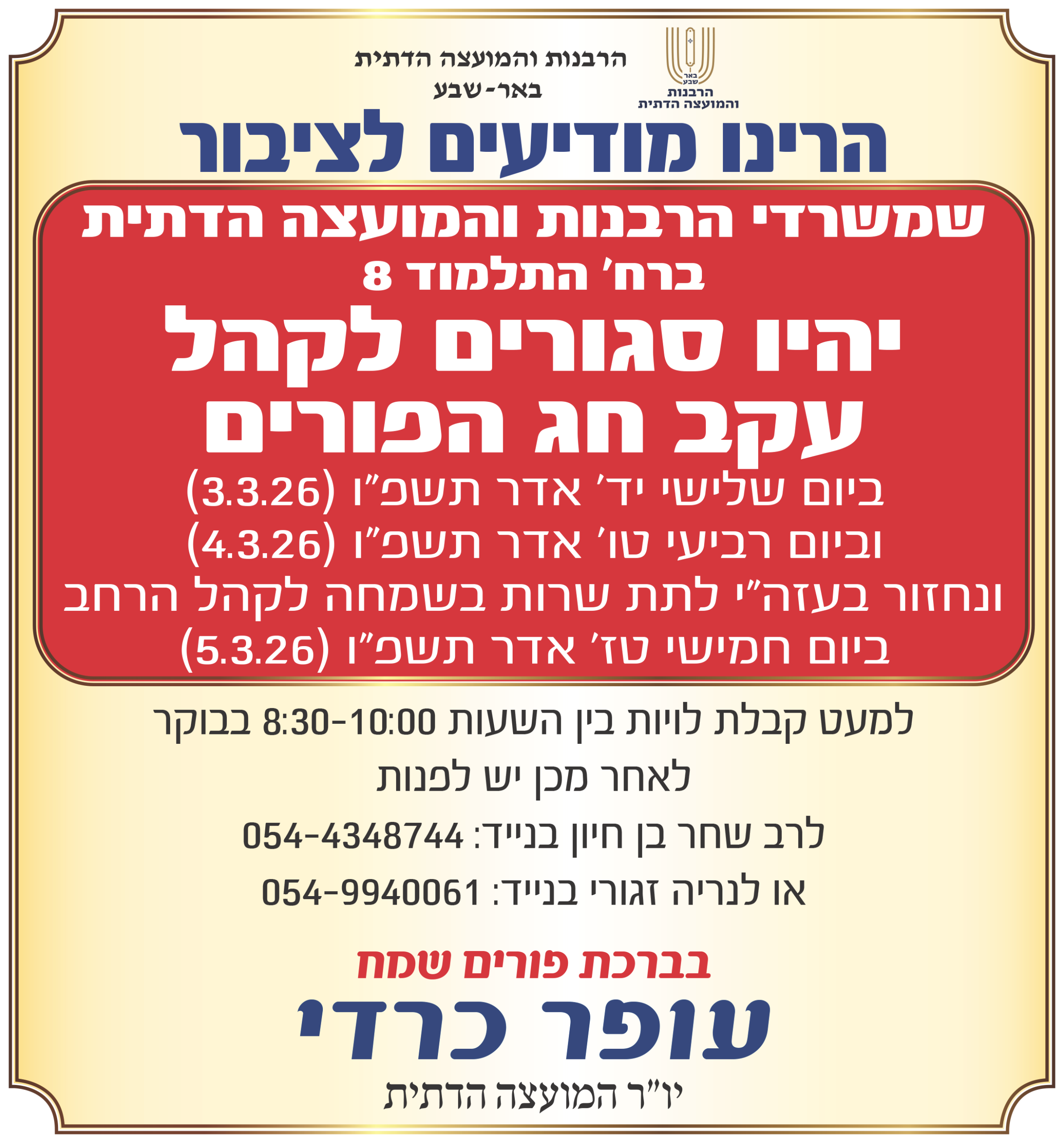 חדשות בכותרות, מהנעשה במועצה בעקבות מרדכי הצדיק – יצאנו להפיץ אורה ושמחה (ומשלוחי מנות): משרדי המועצה יוצאים לחופשה 🎭🍬🍷 פברואר 26, 2026 פורסם על ידי שמעון שחר יפה 26 פבר