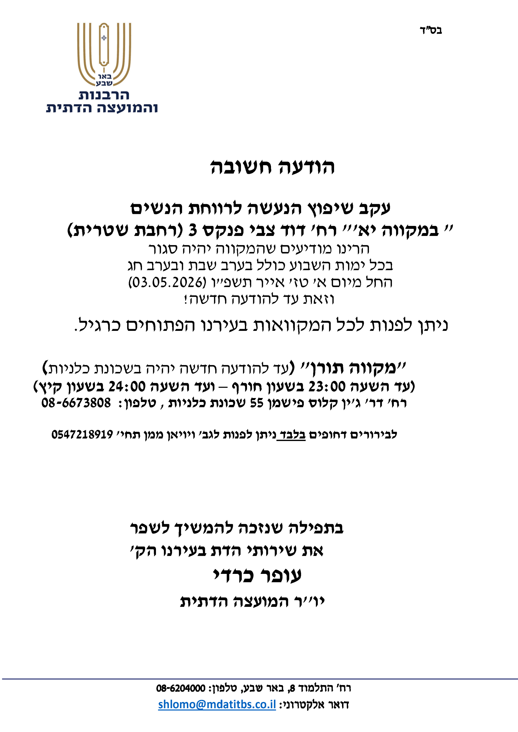 חדשות בכותרות, מהנעשה במועצה הודעה חשובה: מקווה י"א ייסגר זמנית לרגל עבודות שיפוץ אפריל 23, 2026 פורסם על ידי שמעון שחר יפה 23 אפר
