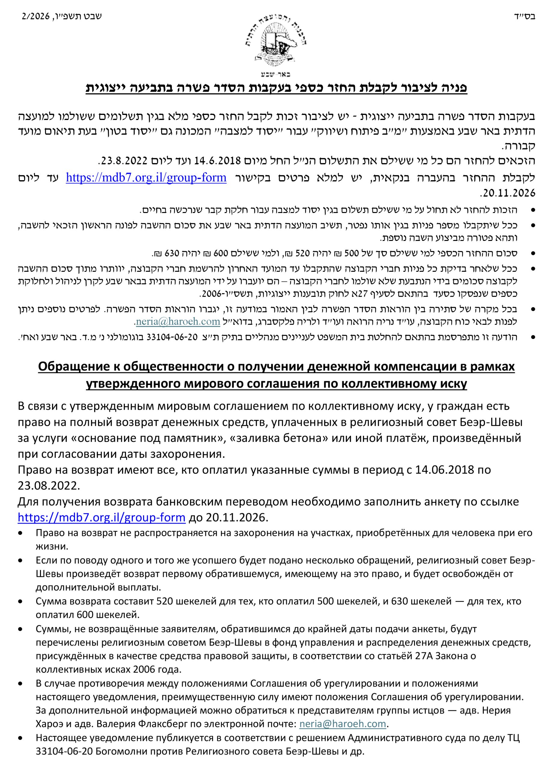 פניה לציבור לקבלת החזר כספי בעקבות הסדר פשרה בתביעה ייצוגית