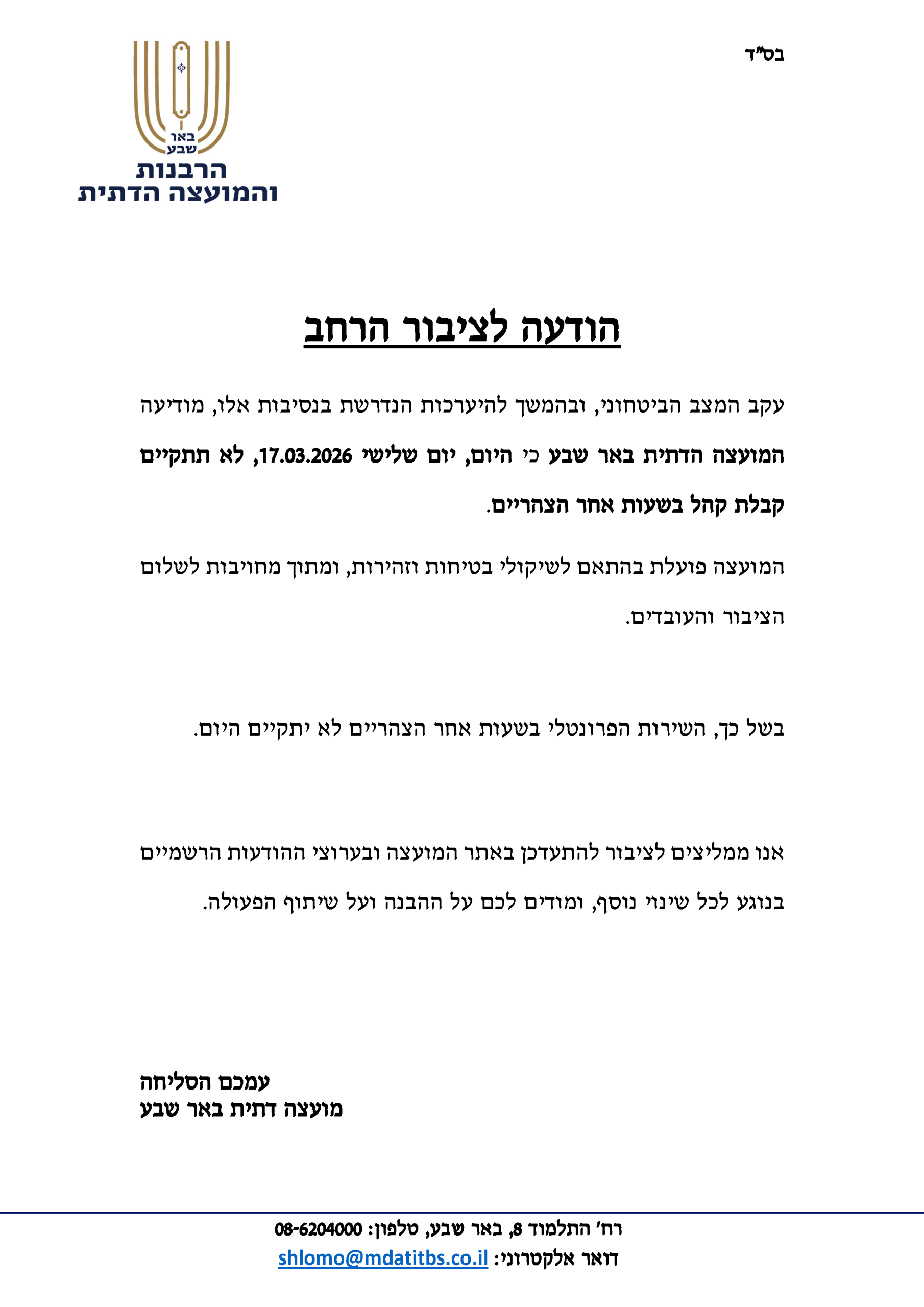 Uncategorized הודעה לציבור: היום לא תתקיים קבלת קהל אחר הצהריים במועצה הדתית באר שבע אפריל 20, 2026 פורסם על ידי שמעון שחר יפה 17 מרץ
